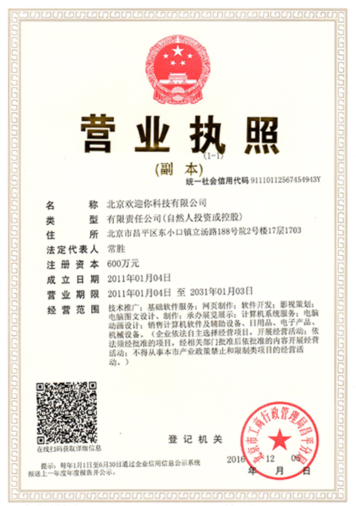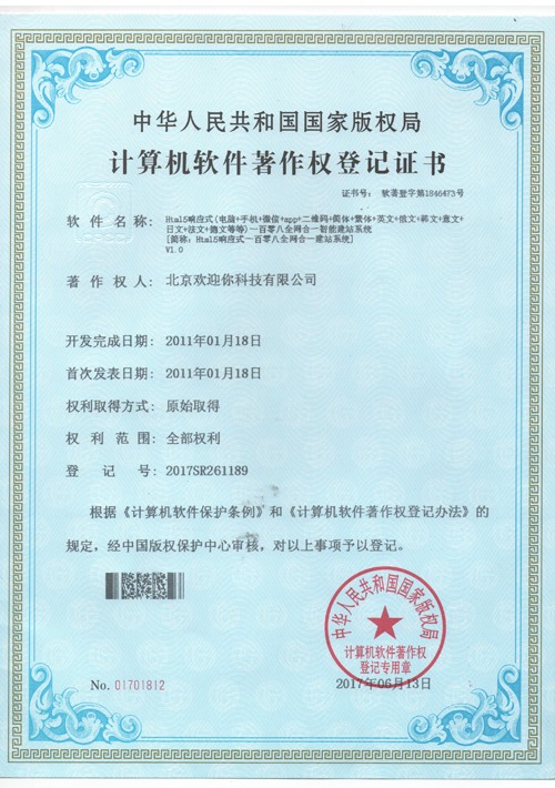 北京歡迎你科技有限公司獲得多項版權(quán)局"計算機軟件著作權(quán)登記證書",并已獲得“全國誠信經(jīng)營示范單位”、“全國質(zhì)量服務(wù)客戶滿意誠信企業(yè)”和“全國重合同守信用品牌企業(yè)”等榮譽稱號。